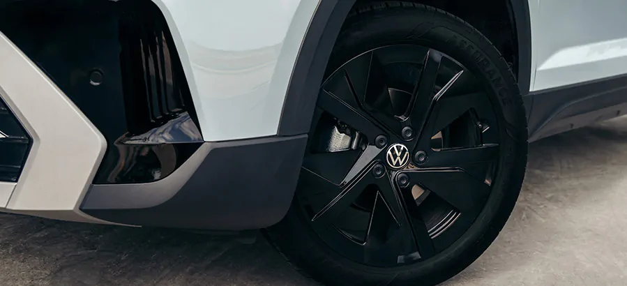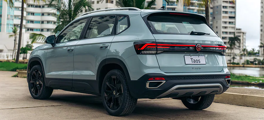 Um carro familiar não precisa abrir mão do estilo. O Taos possui um design imponente e ousado, com uma silhueta elevada e linhas fortes que transmitem robustez. A dianteira é um show à parte, especialmente à noite: a assinatura noturna em LED não só ilumina os faróis, mas também se estende por toda a grade frontal, criando um efeito visual único e sofisticado que o torna inconfundível. É um SUV que marca presença por onde passa, refletindo a força e a modernidade da sua família.