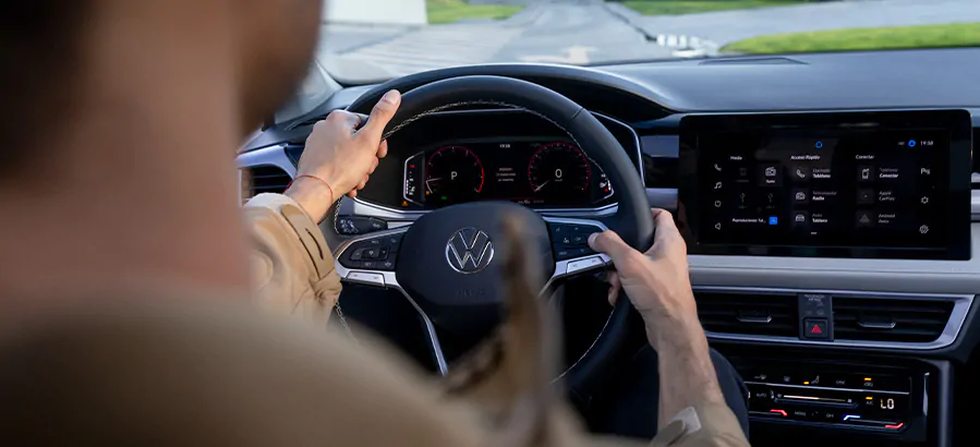 O Taos oferece um ambiente tecnológico pensado para simplificar a rotina. O destaque é o Active Info Display, o painel de instrumentos 100% digital e configurável de 10 polegadas. Você pode personalizar as informações que deseja ver, como o mapa de navegação em tela cheia, tornando a condução mais intuitiva.